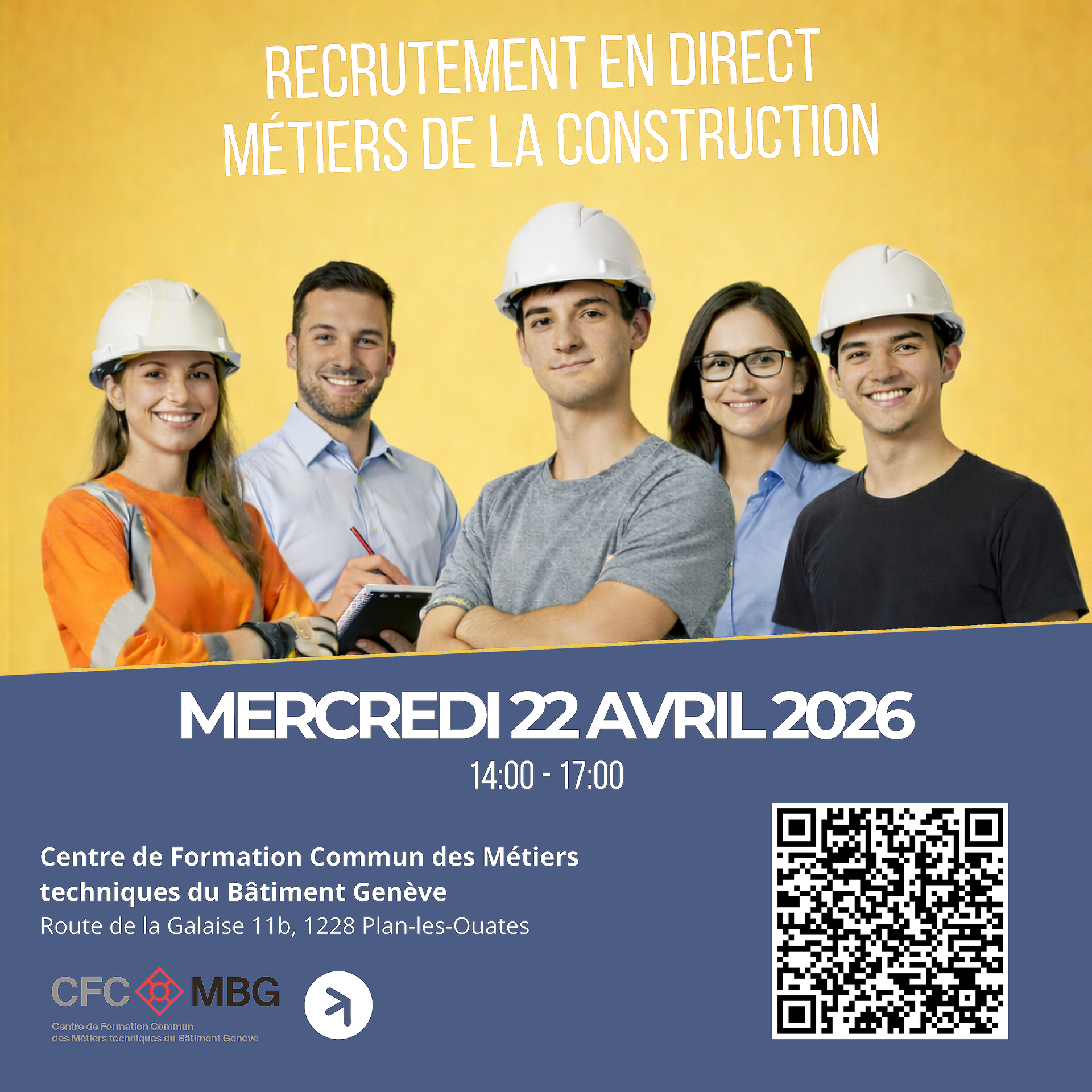Le CFCMBG organise un Recrutement en direct le mercredi 22 avril 2026 de 14h00 à 17h00 dans ses locaux à Tourbillon (Plan-les-Ouates).